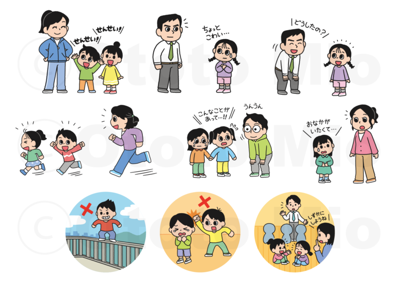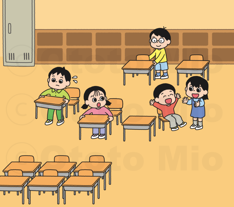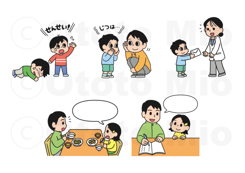給食当番や色々な係など、懐かしい気持ちになりながら描きました。